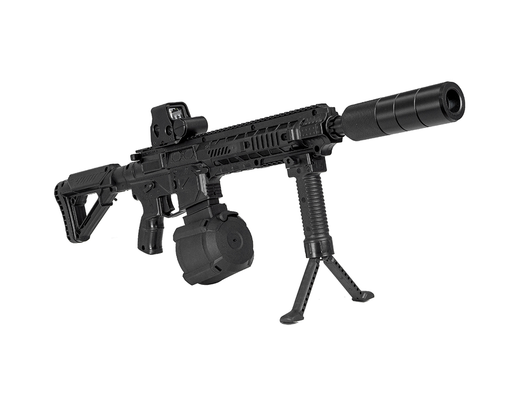 AR-15 platform machine gun with drum magazine. High rate of fire — suppression and area control in one package.